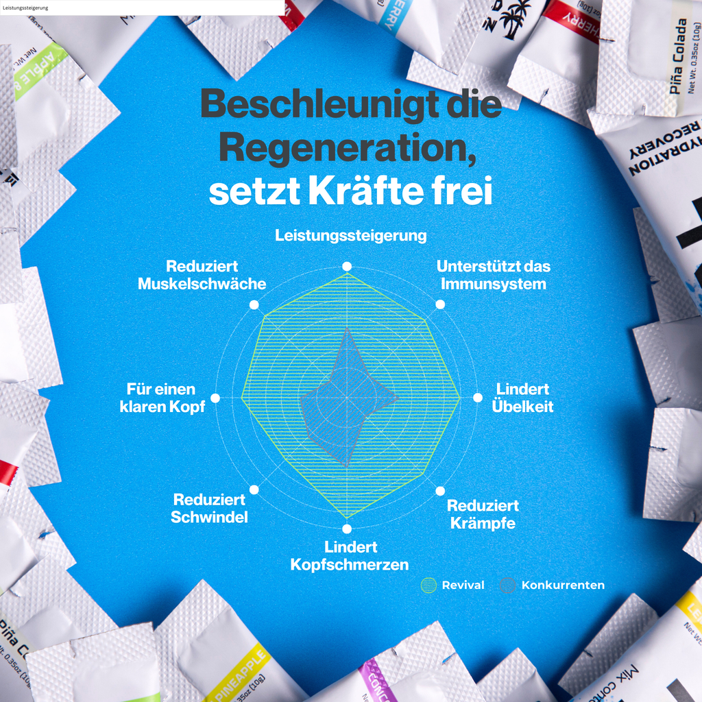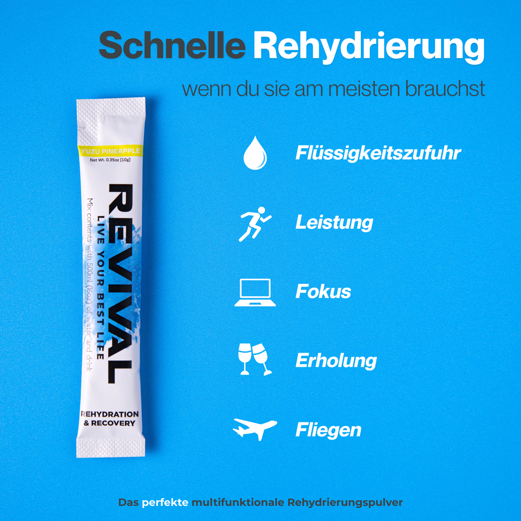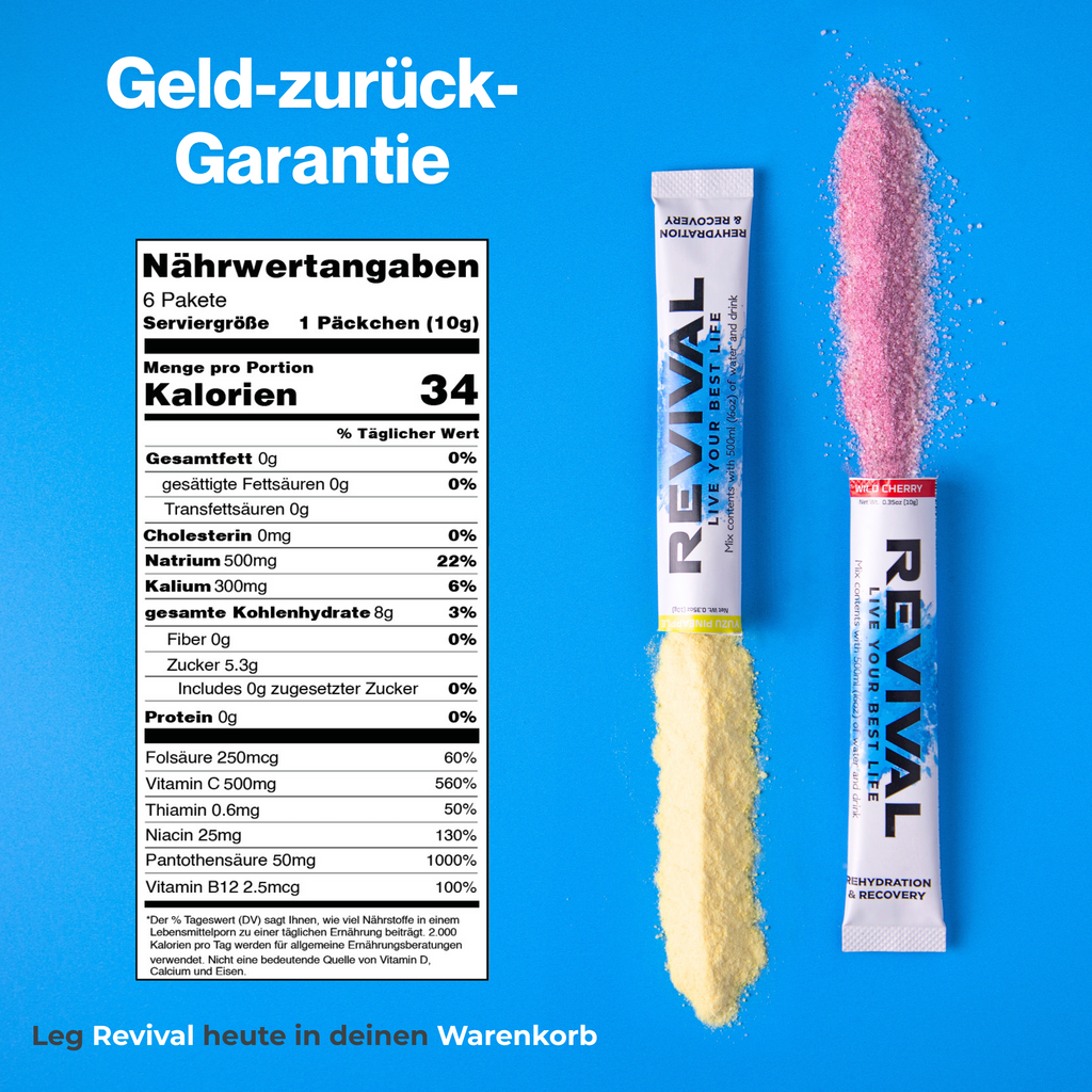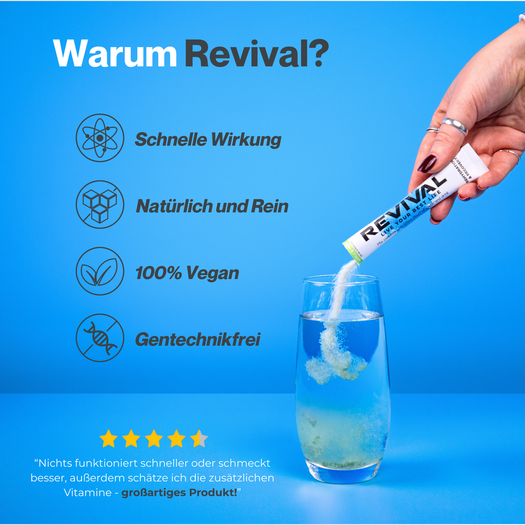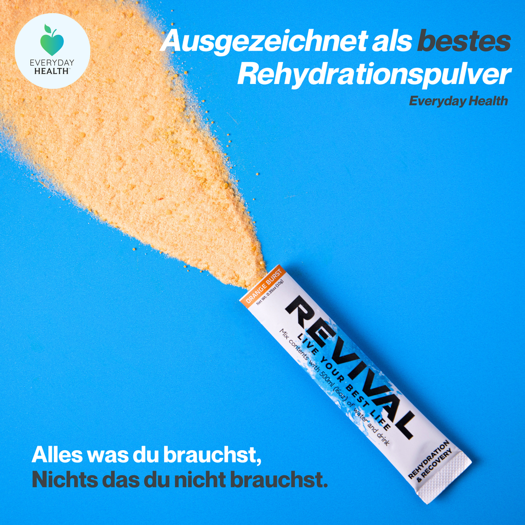 Revival basiert auf einer Formel der Weltgesundheitsorganisation (WHO) und sorgt für eine schnelle Rehydrierung und liefert gleichzeitig eine hohe Dosis an Vitaminen.