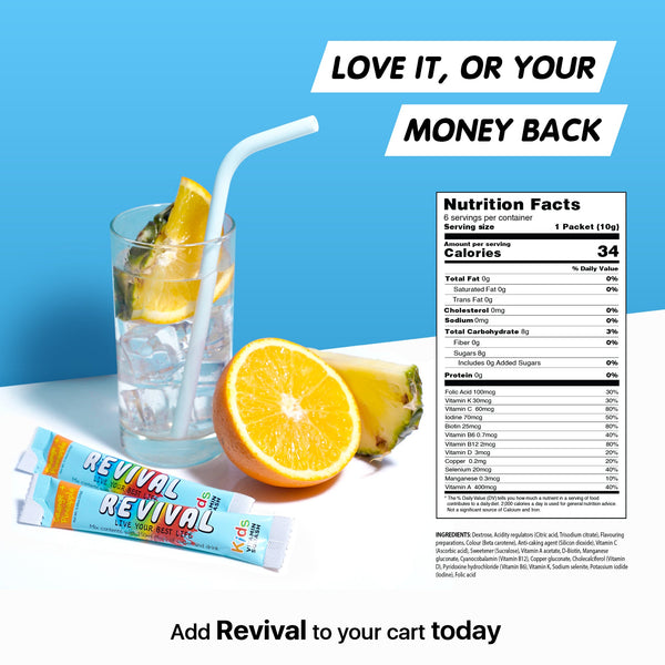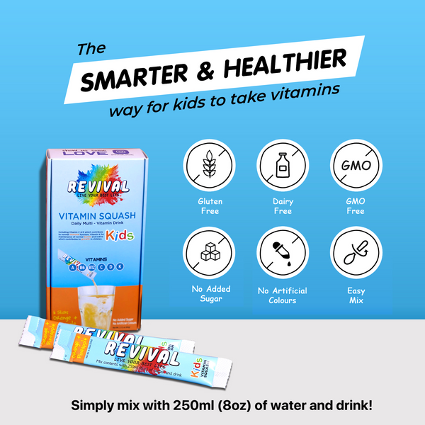 Revival Kids combines the taste and refreshment of a drink with the benefit of a multivitamins supplement.